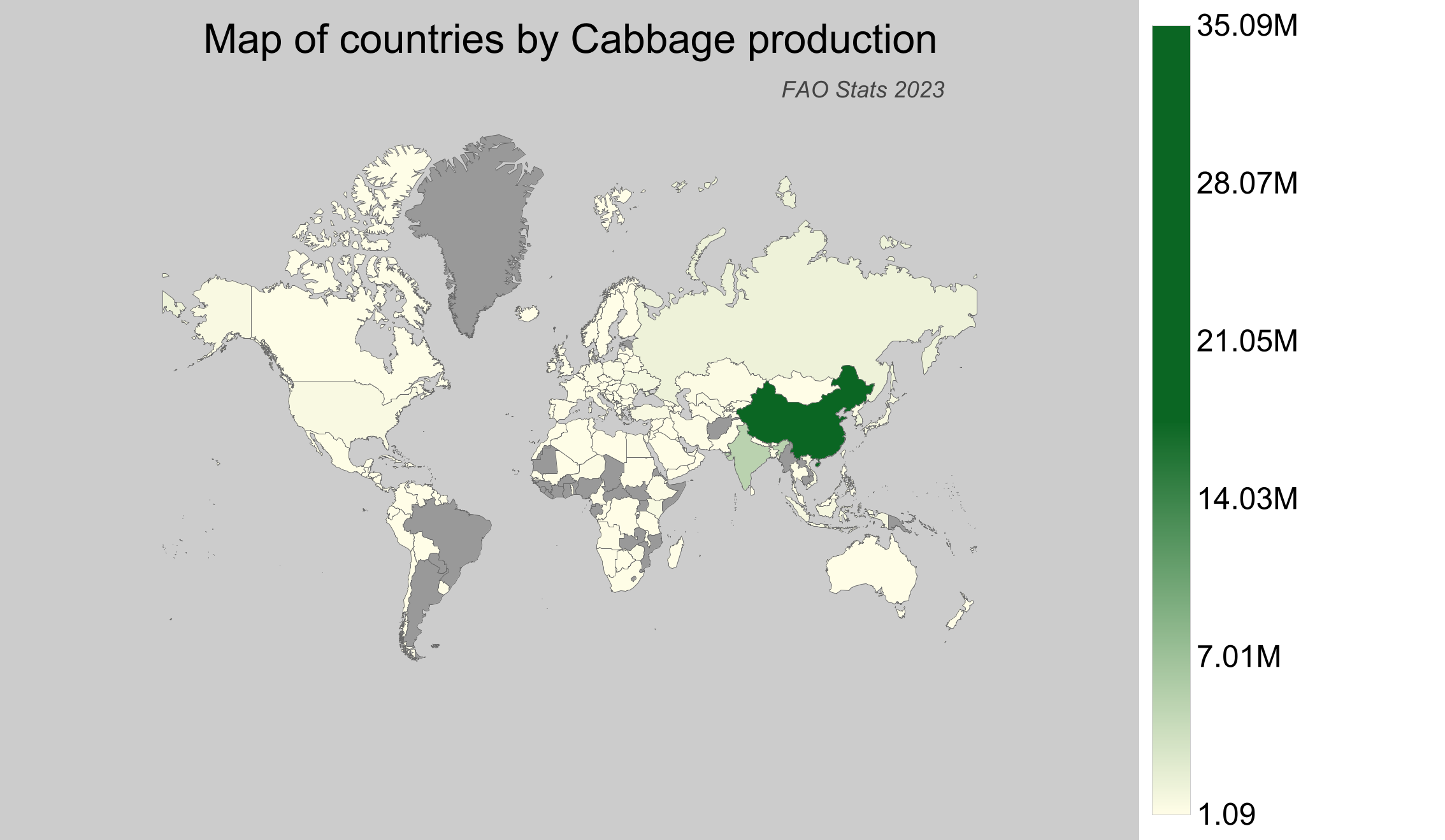 - China is the leading cabbage producer with around 35.1 million tonnes produced, accounting for nearly half of the global production.