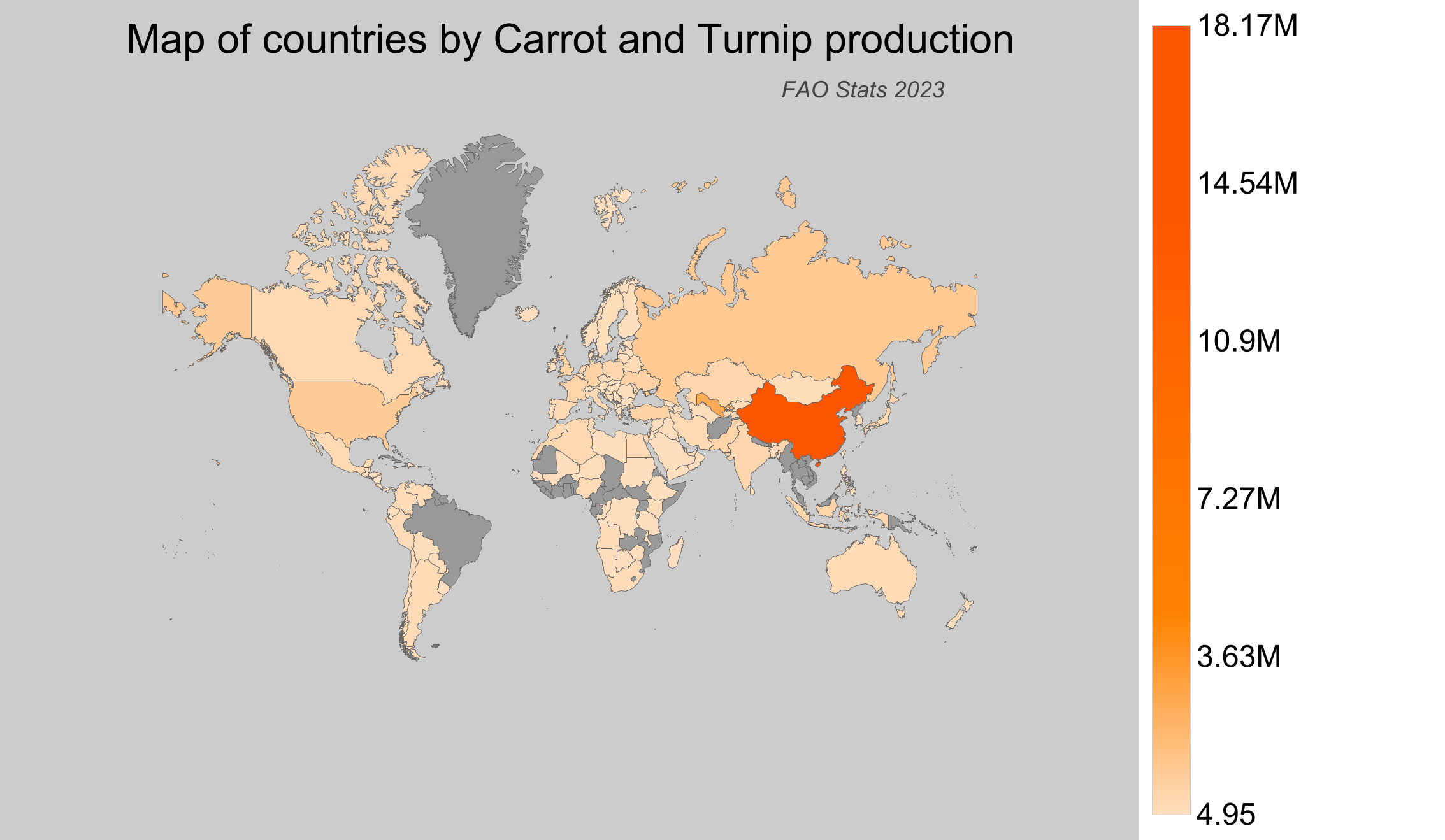 - China is the leading producer, contributing around 18.2 million tonnes of carrots and turnips in 2023, showcasing its dominance in the sector.