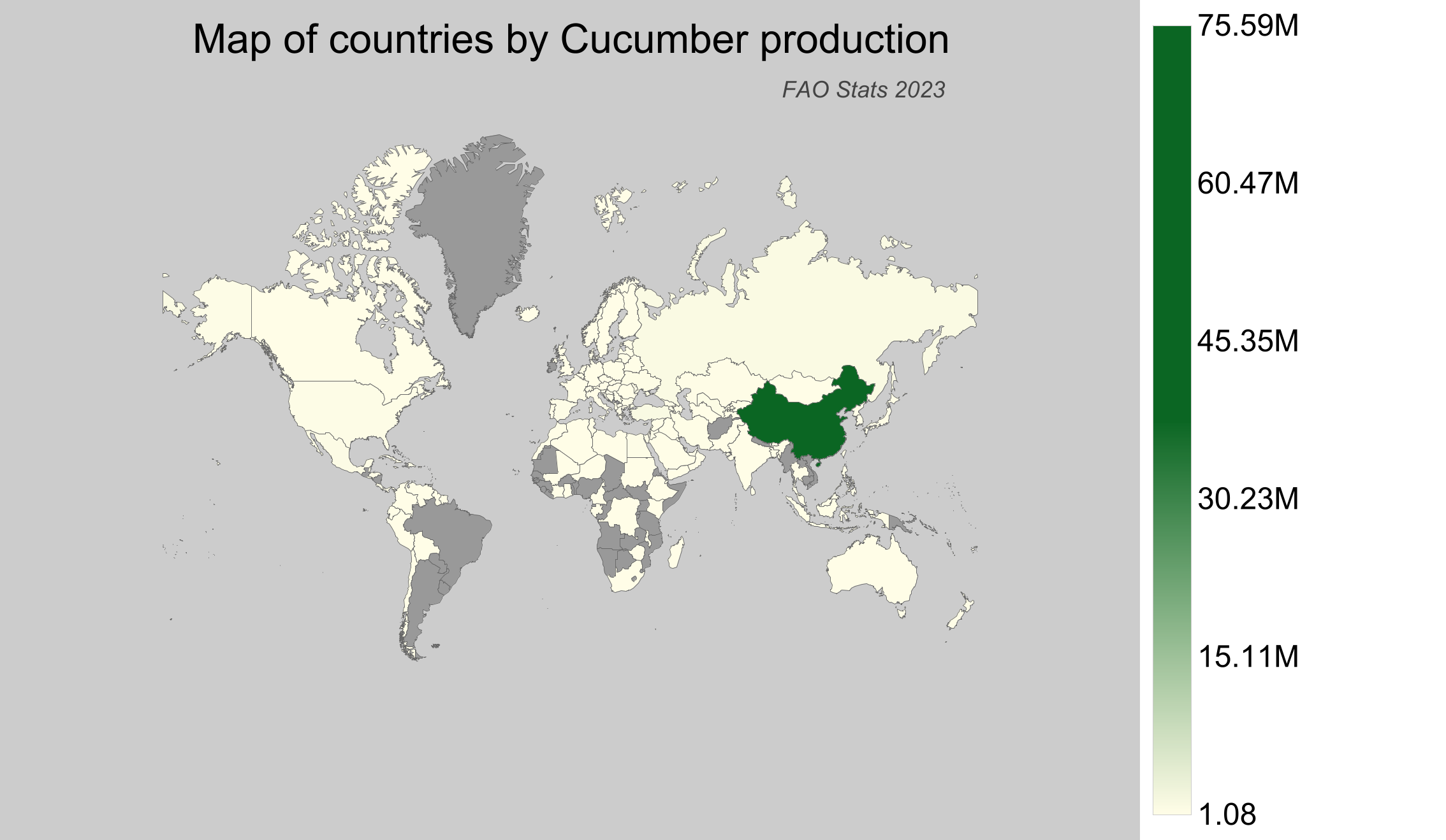 - China dominates the global cucumber market, accounting for over 77% of the total production. This immense share underscores China's pivotal position in global agriculture.