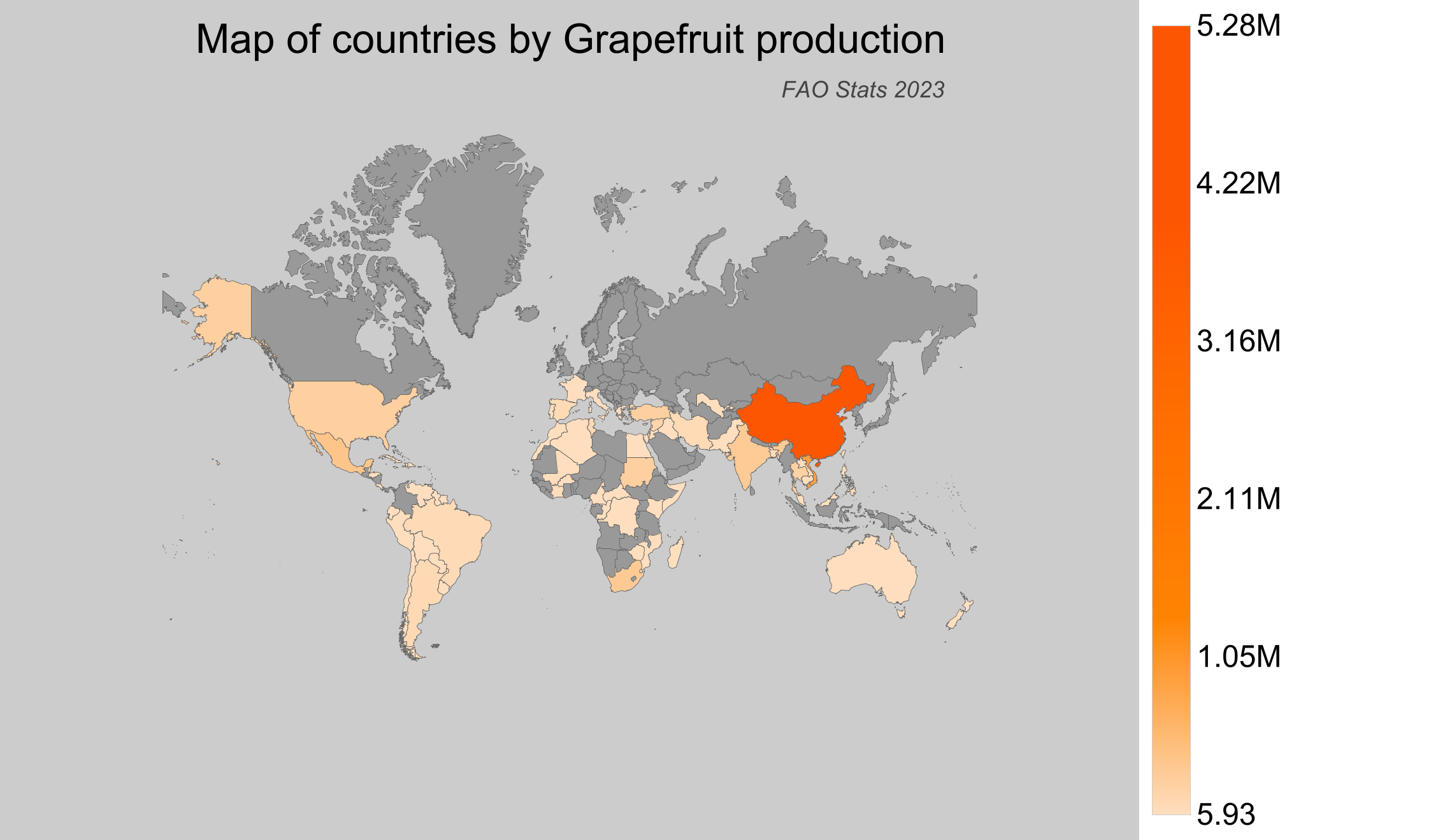 - China led global grapefruit production in 2023 with approximately 5.28 million tonnes.