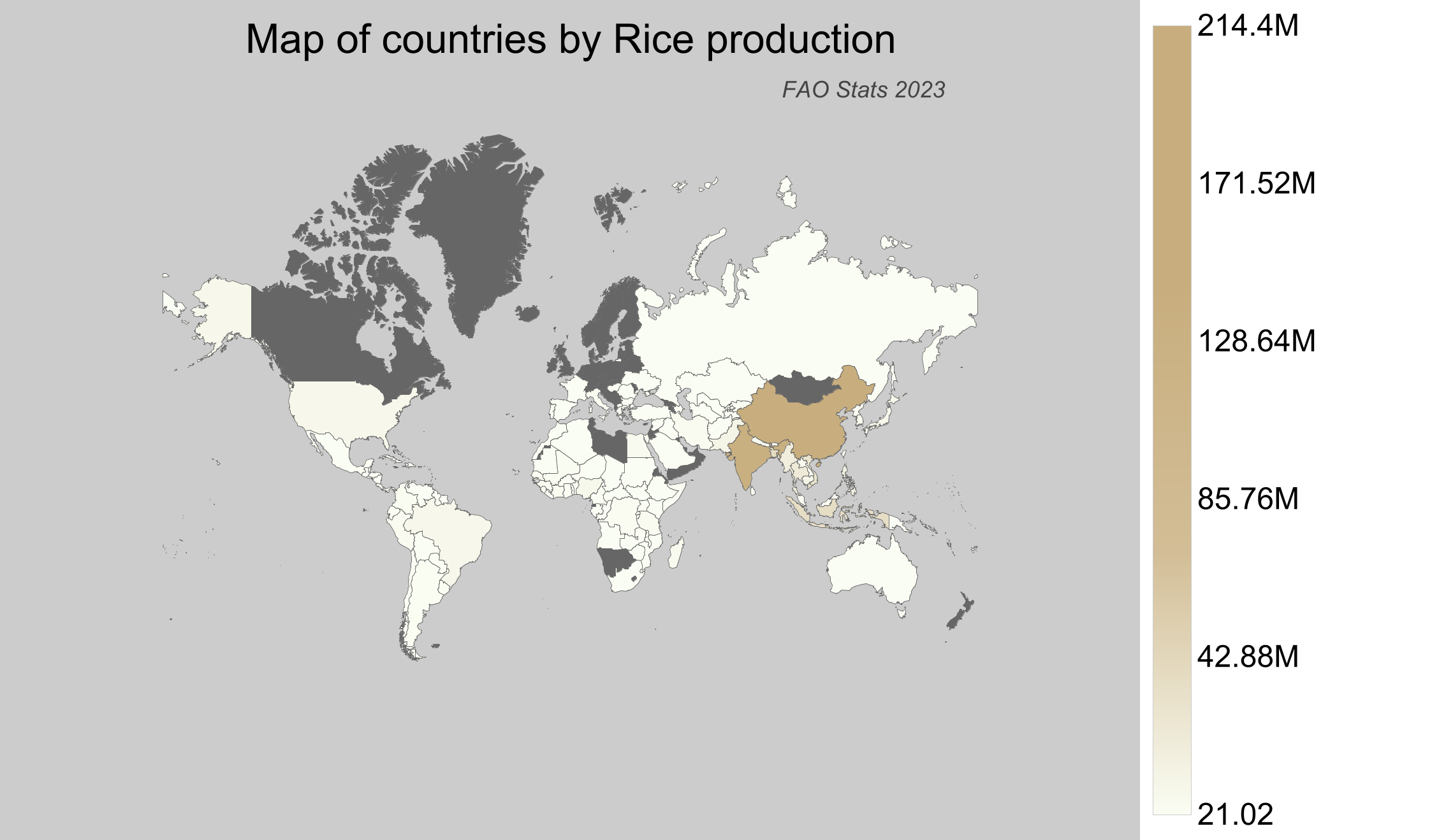 - The significant portion of global production dominated by just China and India emphasizes the concentration of Rice farming in Asia.